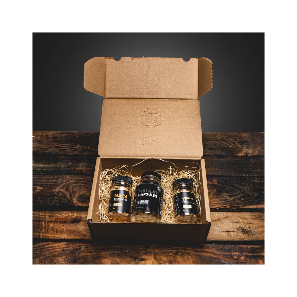 Obsah balíčku: Tongkat Ali kapsle 50ks, Shilajit kapsle 60ks a Maca kapsle 50ks.