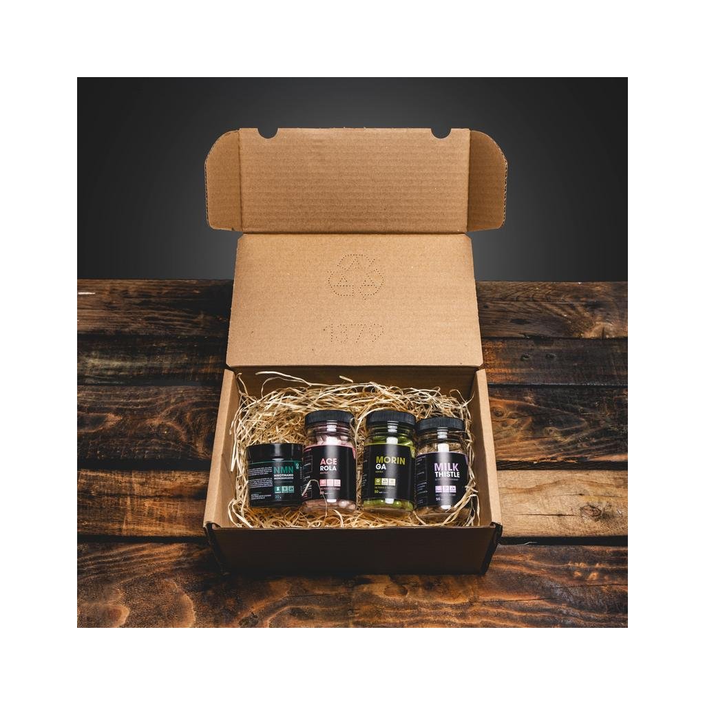 Obsah balíčku: NMN 20g, Moringa kapsle 50ks, Acerola kapsle 50ks a Ostropestřec kapsle 50ks.