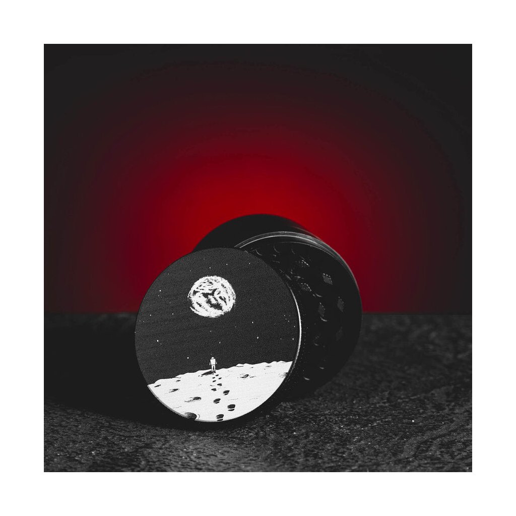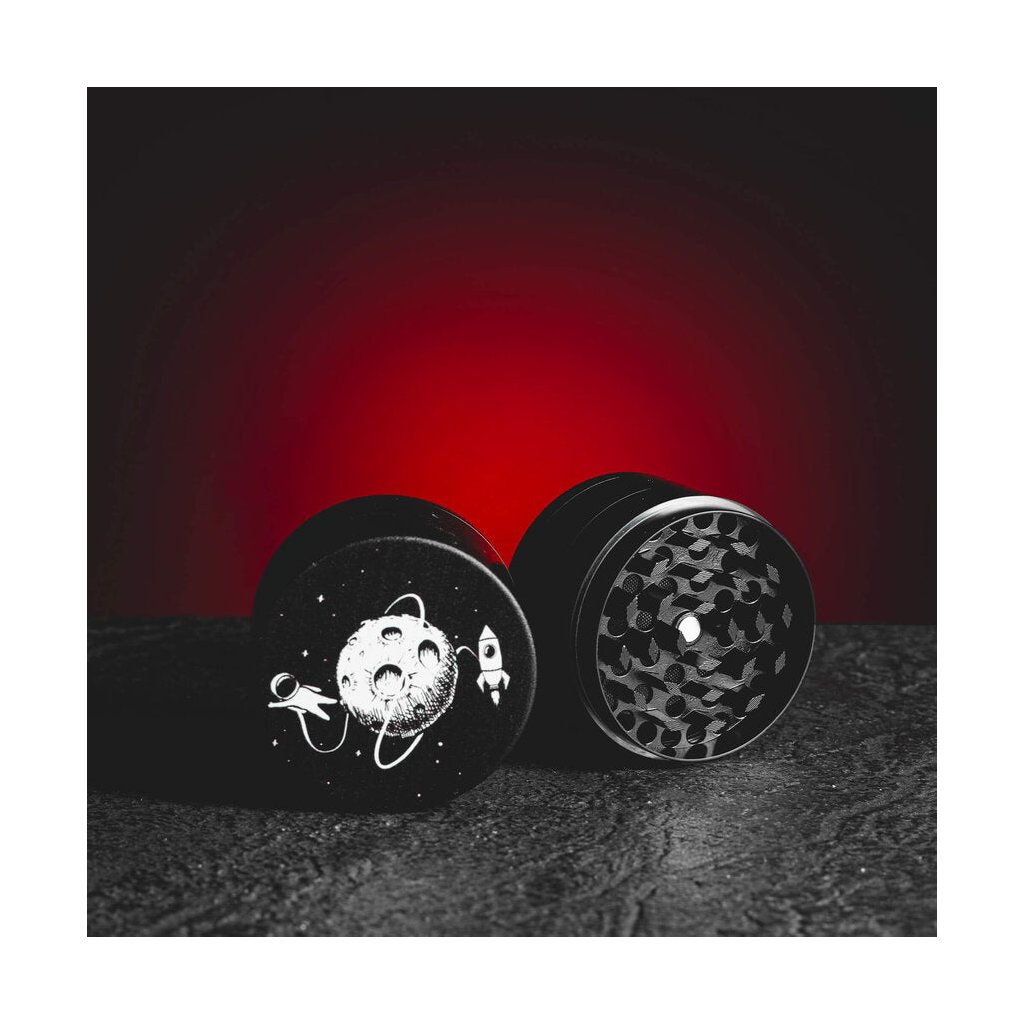 Čtyřdílná drtička se závitem, sítkem a zásobníkem na tabák v černém provedení s hladkým povrchem a bílým planetovým designem na víčku. Drtič na tabák je precizně vyrobený pomocí CNC technologie. Jednotlivé díly drtičky jsou pevně spojené na závit, víčko je na magnet. Precizně broušené drážkované ostří nožů ve tvaru diamantu velmi jemně nadrtí vaši směs do požadované hrubosti.