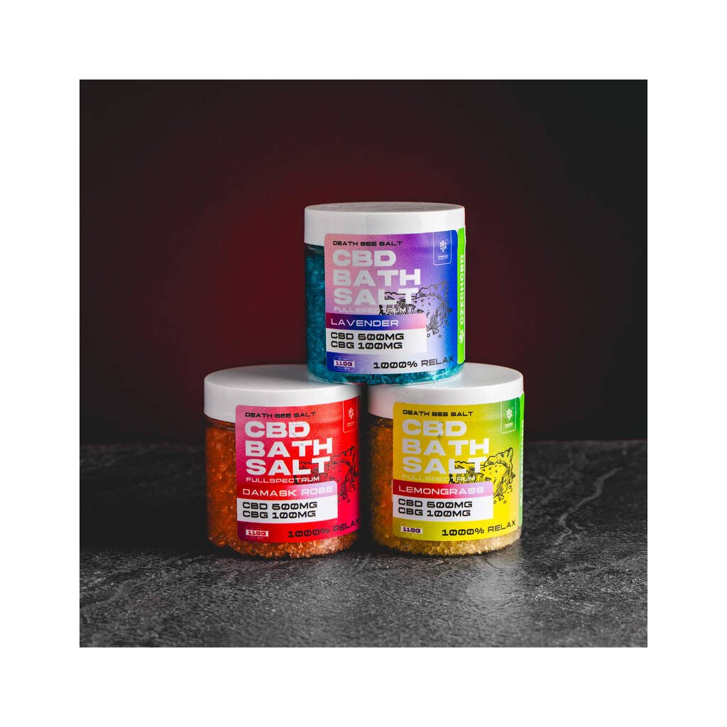 Bath salt, which combines the beneficial effects of Dead Sea salt, fullspectrum CBD, CBG, and organic argan oil. This unique blend provides not only deep relaxation but also intensive care for your skin. Each variant is enriched with a specific aroma - either refreshing lemongrass, calming lavender, or noble damask rose, each bringing its unique properties. Lemongrass provides a refreshing and invigorating effect, acts against stress and tension, and promotes a healthy complexion. Lavender and damask rose are known for their calming and harmonizing effects.