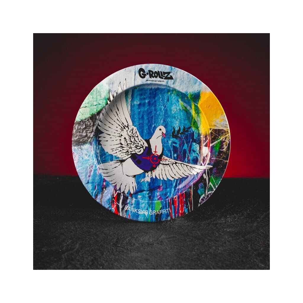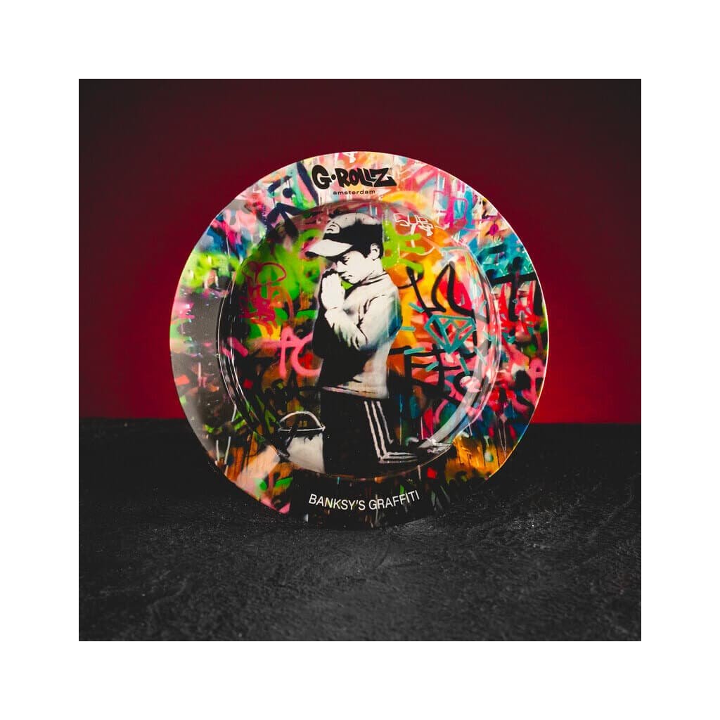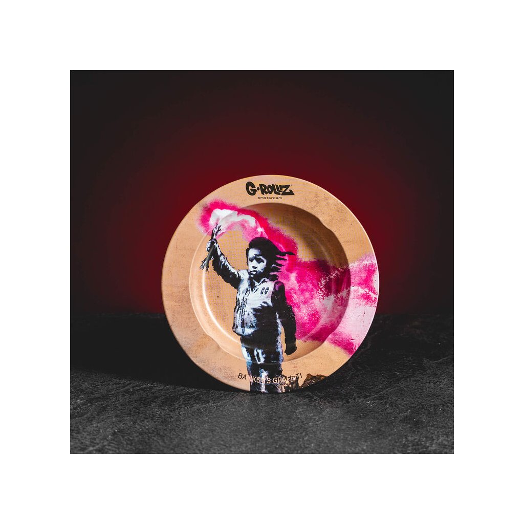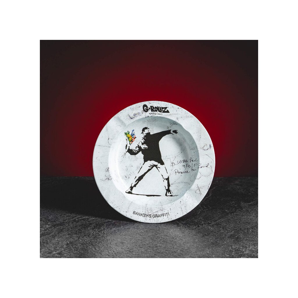 Metal ashtray with a diameter of 13.5cm, available in various designs from Banksy's workshop.