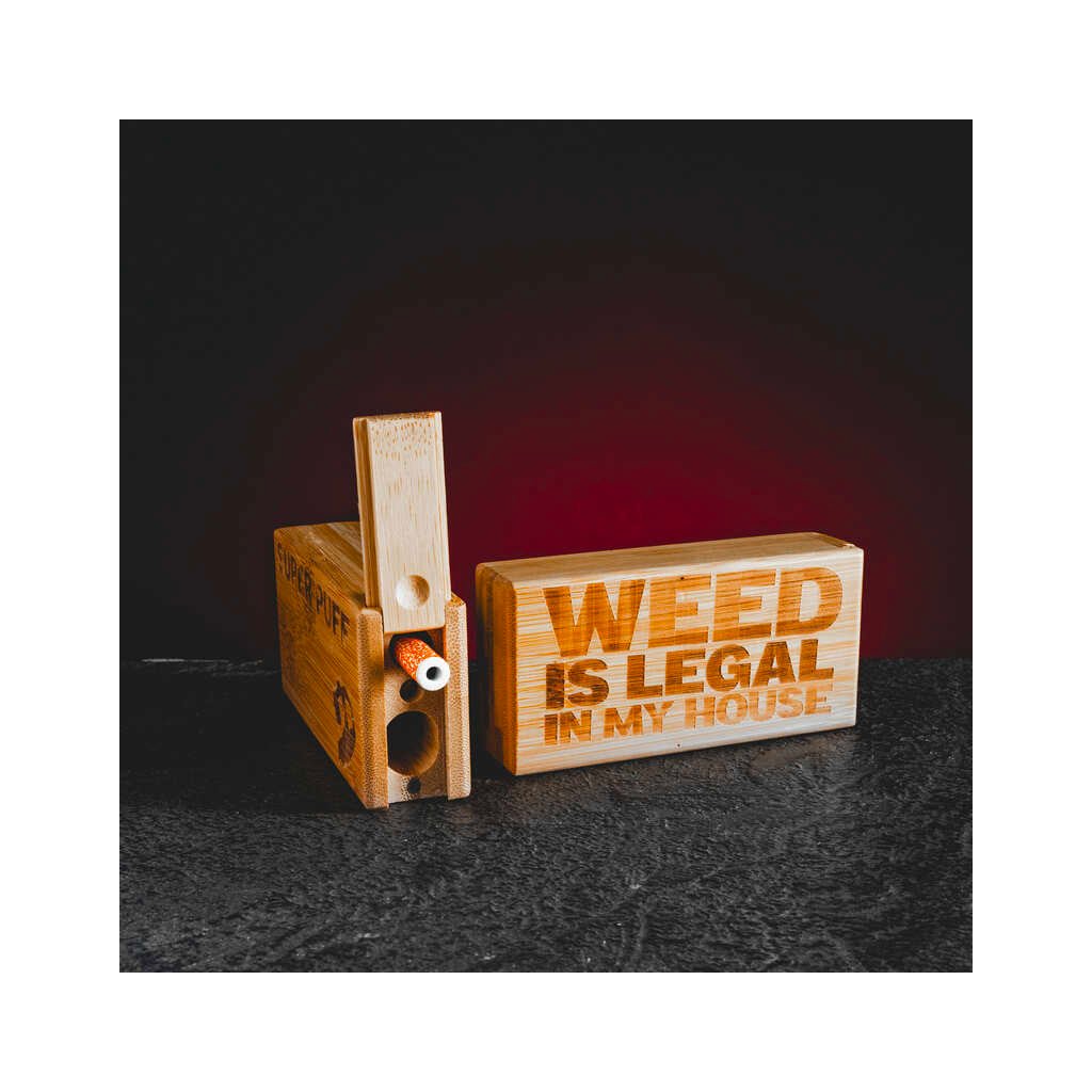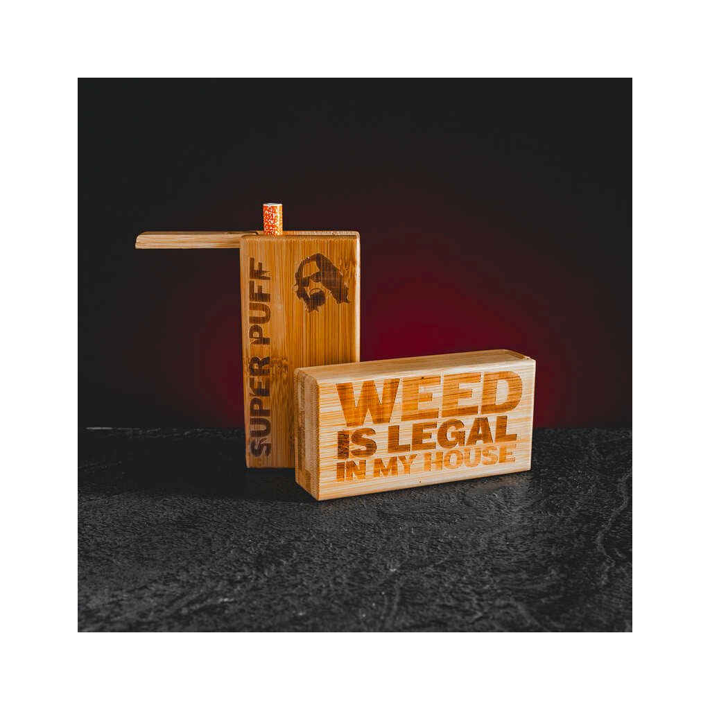 Super Puff One Hit set bamboo wood with tamper and cigarette. Size 51 x 102mm. For easy and discreet use.