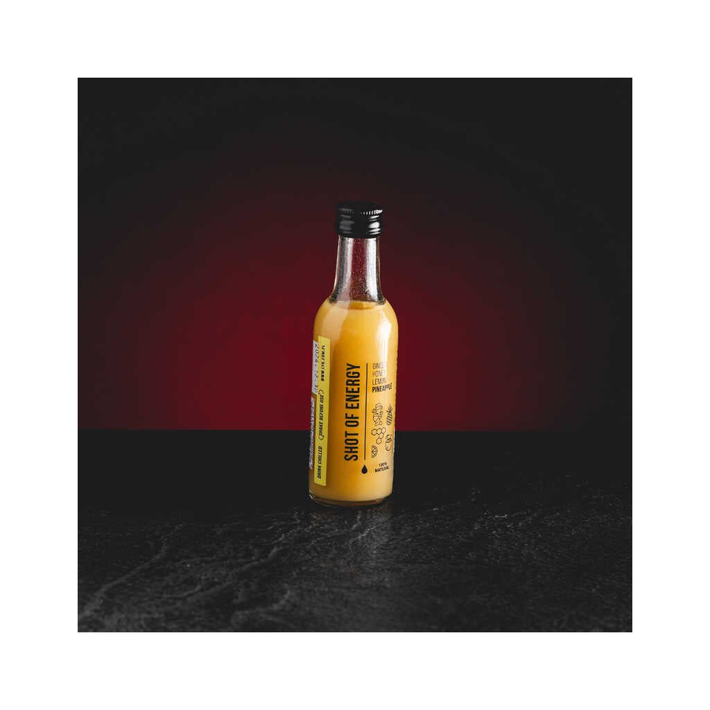 Shot of Energy: Pro ty, kteří hledají jemnější chuť a více energie - obohatili jsme základní Shot o ananas. Díky němu náš shot nejen dodává energii, ale také pomáhá překonávat bolest a dále posiluje imunitu. Složení: Zázvorová šťáva 54%, citronová šťáva 8%, med 15%, ananasová šťáva 15%, kokosová voda 8%