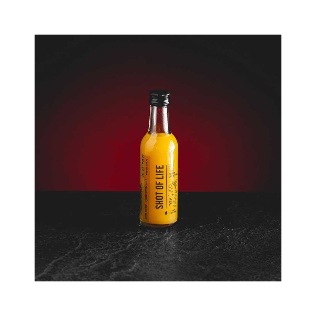 Shot of Life: Tento Shot je nepostradatelným spojencem v boji za dobrou kondici: skvělou postavu a silné tělo. Ať už potřebujete podporu v boji proti přibírání na váze nebo celkové posílení organismu - kurkuma a kajenský pepř jsou ideálními kandidáty. Pro celkové zdraví - nezanedbatelný je i jejich společný protirakovinný účinek! Složení: Zázvorová šťáva 56%, med 15%, citronová šťáva 12%, kokosová voda 8%, kurkumová šťáva 7%, kajenský pepř 2%